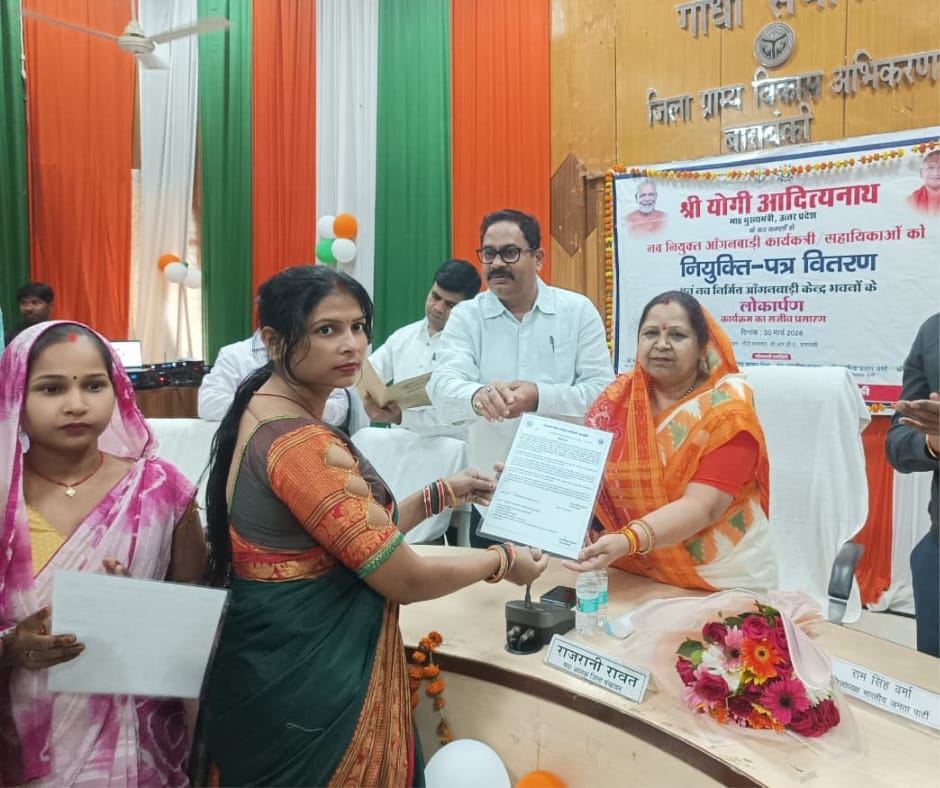 Barabanki: आंगनबाड़ी कार्यकत्रियों और सहायिकाओं को नियुक्ति पत्र वितरण, नए आंगनबाड़ी केंद्रों का लोकार्पण और स्मार्ट मोबाइल वितरण कार्यक्रम आयोजित किया गया। मुख्यमंत्री योगी आदित्यनाथ के कार्यक्रम का सीधा प्रसारण भी किया गया। बाराबंकी, उत्तर प्रदेश | 30 मार्च 2026 जिला सूचना कार्यालय, बाराबंकी द्वारा जारी प्रेस नोट के अनुसार, 30
