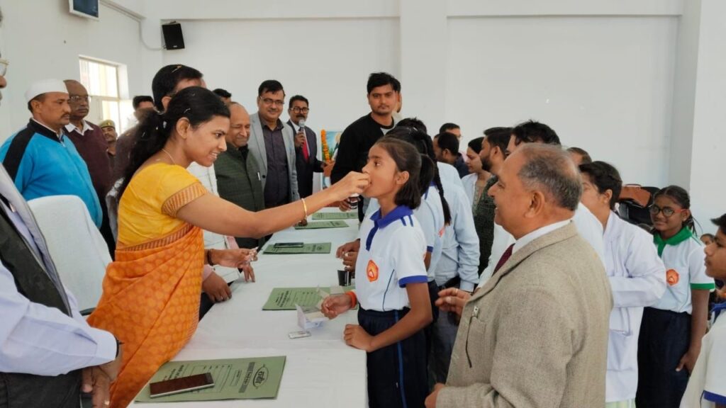 Banda: मण्डलायुक्त अजीत कुमार एवं जिलाधिकारी जे. रीभा ने बच्चों को खिलाई एल्बेण्डाजोल टैबलेट