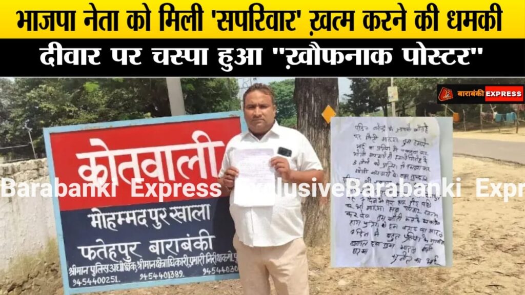 बाराबंकी में भाजपा किसान मोर्चा के पूर्व मंडल उपाध्यक्ष नरेन्द्र शुक्ला और परिवार को पुलिस की मुखबिरी के शक में पोस्टर चस्पा कर दी गई जान से मारने की धमकी। दीवार पर चस्पा खौफनाक पोस्टर ने गांव में मचाया हड़कंप। पढ़ें पूरा मामला विस्तार से।