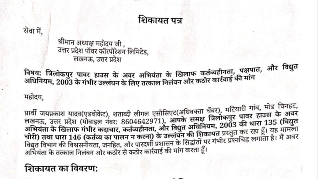उत्तर प्रदेश सरकार द्वारा बिजली चोरी और भ्रष्टाचार के खिलाफ सख्त रुख अपनाने के बावजूद बाराबंकी जिले के त्रिलोकपुर पावर हाउस से जुड़ा एक विवादास्पद मामला सामने आया है। अधिवक्ता जयप्रकाश यादव ने उत्तर प्रदेश पावर कॉरपोरेशन लिमिटेड (UPPCL) के अध्यक्ष को शिकायत पत्र सौंपते हुए त्रिलोकपुर में तैनात अवर अभियंता पर गंभीर आरोप लगाए हैं। आरोप है कि अवर अभियंता ने एक कथित बिजली चोरी की शिकायत पर समय से कार्रवाई नहीं की और शिकायत को टालते रहे।