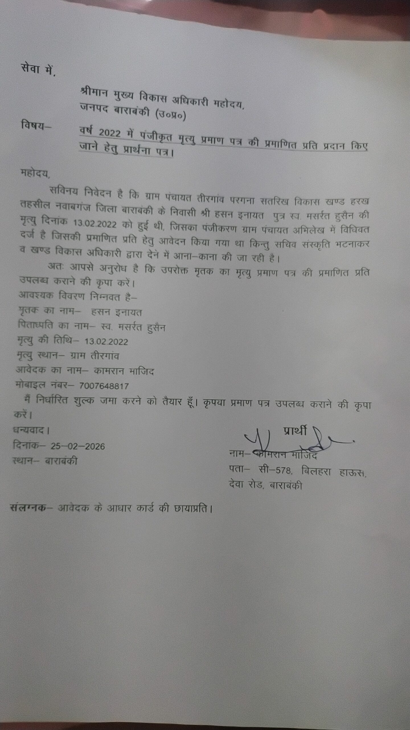 ताजा मामला नवाबगंज तहसील क्षेत्र का है, जहां वरिष्ठ पत्रकार कामरान माजिद द्वारा मृत्यु प्रमाण पत्र की प्रमाणित प्रति के लिए 24 फरवरी 2026 को हरख ब्लॉक में आवेदन किया गया था।