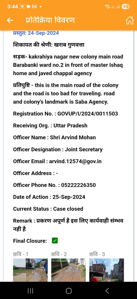ज़ुबैर अहमद ने बताया कि उन्होंने इस समस्या को लेकर दिनांक 24 सितम्बर 2024 को आईजीआरएस पोर्टल पर तस्वीरों के साथ शिकायत दर्ज कराई थी और सड़क बनवाने की मांग की थी। शिकायत के बाद उनके पास नगर पालिका के जेई का फोन आया। जेई ने उन्हें बताया कि इस सड़क के निर्माण के लिए उन्हें चेयरमैन शीला सिंह के प्रतिनिधि सुरेंद्र वर्मा (सुरेंद्र भैया) से बात करनी होगी।
