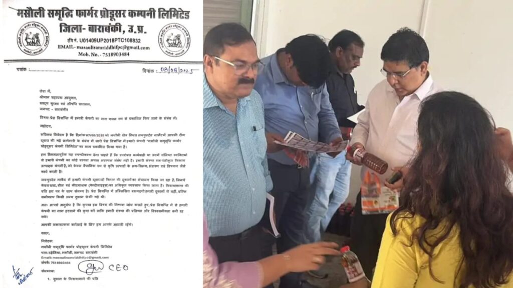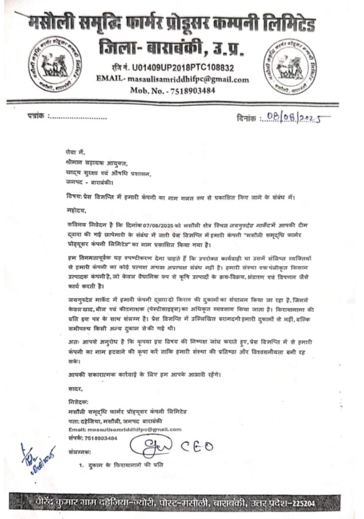 छापेमारी तक मामला ठीक रहा, लेकिन विवाद तब शुरू हुआ जब FSDA द्वारा जारी प्रेस नोट में “मसौली समृद्धि फार्मर प्रोड्यूसर कंपनी लिमिटेड” का नाम जोड़ दिया गया। यह कंपनी जय गुरुदेव मार्केट में ही किराए पर दो दुकानों लेकर वैधानिक रूप से बीज, खाद और कीटनाशकों का कारोबार करती है।