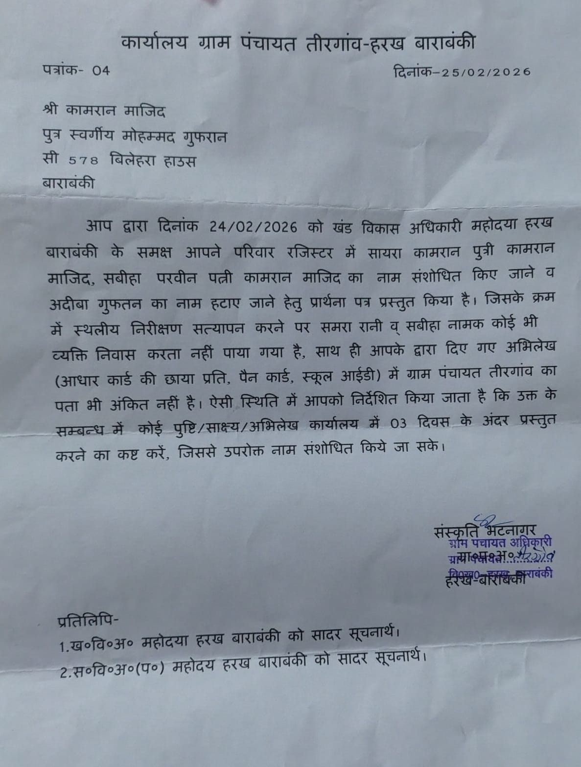 10 मार्च को सचिव की ओर से रजिस्टर्ड डाक द्वारा एक पत्र भेजा गया। जो 25 फरवरी 2026 को जारी और 7 मार्च 2026 समय 12:33 बजे हरख पोस्ट ऑफिस से पोस्ट किया गया था। जिसमें कहा गया कि स्थलीय निरीक्षण में संबंधित व्यक्ति गांव में निवास करते नहीं पाए गए हैं, इसलिए तीन दिन के भीतर साक्ष्य प्रस्तुत किए जाएं।
