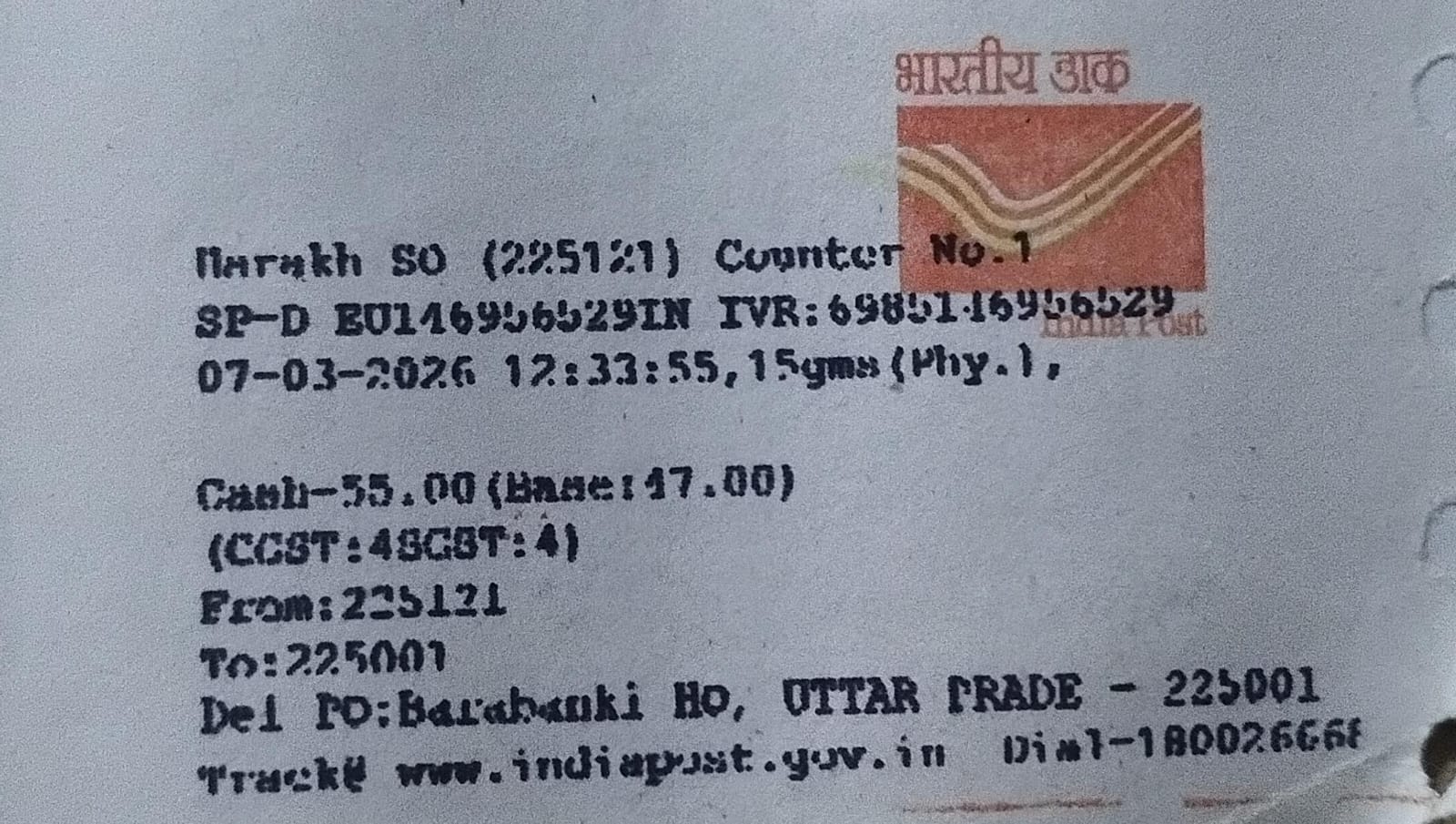 सचिव संस्कृति भटनागर द्वारा रजिस्टर्ड डाक से भेजे गए पत्र पर 25 फरवरी 2026 की तारीख दर्ज है, जबकि लिफाफे पर हरख पोस्ट ऑफिस की जो रसीद चस्पा है उस पर बुकिंग की तारीख 7 मार्च 2026 और समय करीब 12:33 बजे दर्ज है। ऐसे में सवाल उठता है कि 25 फरवरी का कंप्यूटर टाइप्ड पत्र 7 मार्च को रजिस्टर्ड डाक से क्यों भेजा गया?