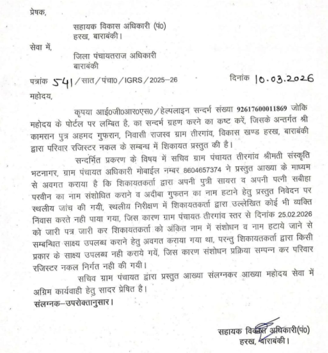 पत्रकार कामरान अल्वी ने बताया कि उन्होंने 25 फरवरी 2026 को मुख्यमंत्री पोर्टल पर ऑनलाइन शिकायत दर्ज कराई और परिवार रजिस्टर संशोधन तथा नकल जारी कराने की मांग की। जिसकी जांच जिला पंचायत राज अधिकारी को सौंपी गई थी।