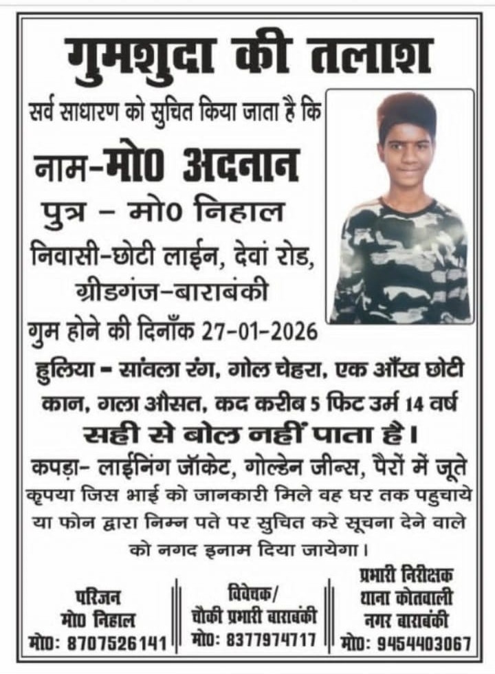 बाराबंकी के नगर कोतवाली क्षेत्र से 14 वर्षीय किशोर मो० अदनान लापता। पुलिस ने गुमशुदगी का पोस्टर जारी कर आमजन से मदद की अपील की। सूचना देने पर नकद इनाम।