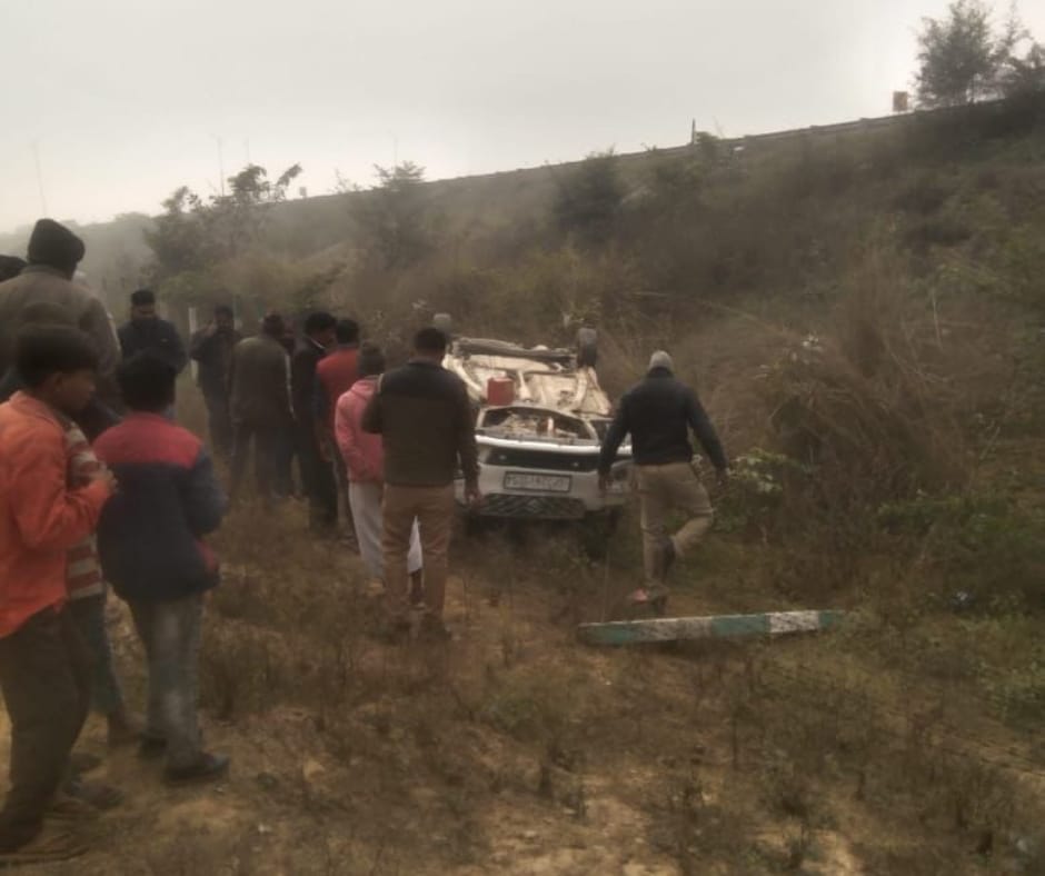 ओवरटेक के प्रयास में अनियंत्रित होकर खाई में पलटी कार