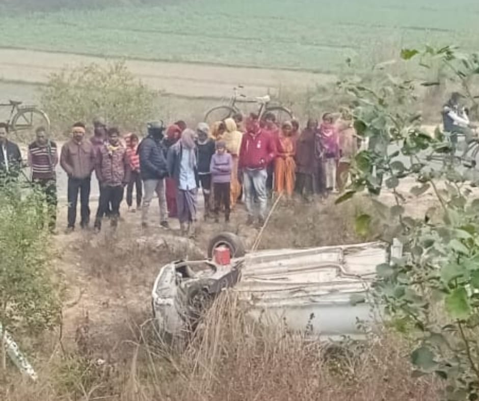 ओवरटेक के प्रयास में अनियंत्रित होकर खाई में पलटी कार