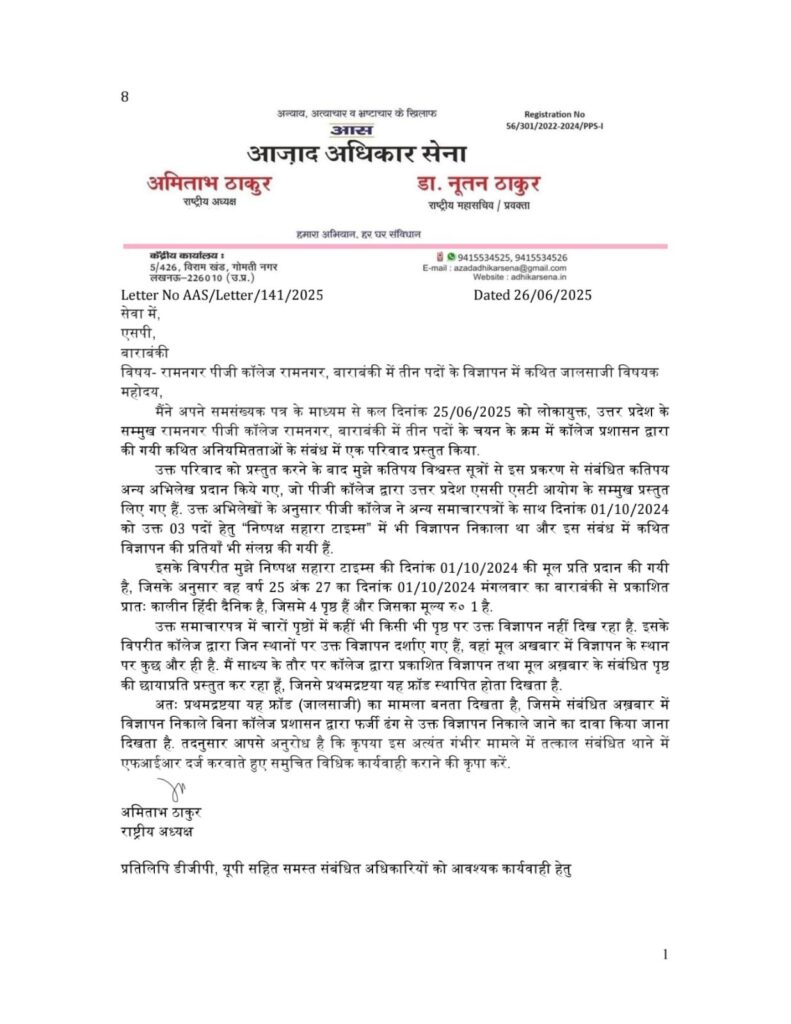 रामनगर पीजी कॉलेज में समूह ‘ग’ के पदों पर हुई भर्ती प्रक्रिया अब महा-घोटाले के भंवर में फंस गई है। आजाद अधिकार सेना के राष्ट्रीय अध्यक्ष अमिताभ ठाकुर ने कॉलेज प्रशासन पर गंभीर अनियमितताओं और फर्जी अभिलेखों के इस्तेमाल का आरोप लगाते हुए, एडीएम बाराबंकी अरुण सिंह और कॉलेज के चर्चित प्रिंसिपल कौशलेंद्र विक्रम मिश्रा के खिलाफ लोकायुक्त में शिकायत के बाद अब एसपी बाराबंकी समेत उच्चाधिकारियों को पत्र भेजकर तत्काल FIR दर्ज करने की मांग की है।