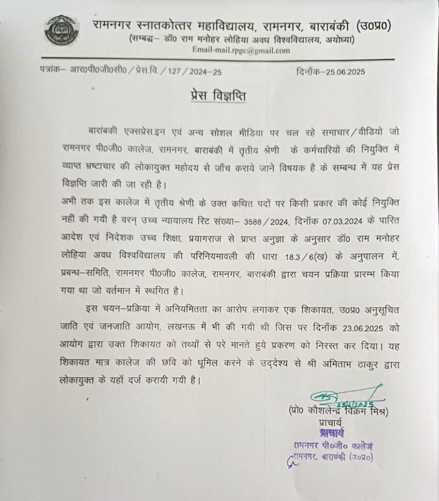 मीडिया और सोशल मीडिया पर लोकायुक्त शिकायत से संबंधित खबरें फैलने के बाद, रामनगर पीजी कॉलेज के प्रिंसिपल कौशलेंद्र विक्रम मिश्रा ने 25 जून 2025 को एक प्रेस नोट जारी कर अपनी सफाई दी थी। उन्होंने दावा किया था कि इस मामले से संबंधित एक शिकायत को उत्तर प्रदेश अनुसूचित जाति एवं जनजाति आयोग लखनऊ द्वारा 23 जून 2025 को तथ्यों से परे मानते हुए निरस्त कर दिया गया था। प्रिंसिपल मिश्रा ने अमिताभ ठाकुर पर कॉलेज की छवि धूमिल करने का आरोप भी मढ़ा था। हालांकि, प्रिंसिपल द्वारा 25 जून 2025 को जारी प्रेस नोट में इस बात का कोई जिक्र नहीं किया गया कि उच्च न्यायालय रिट संख्या 3588/2024, दिनांक 07.03.2024 के पारित आदेश एवं निदेशक उच्च शिक्षा, प्रयागराज से प्राप्त अनुज्ञा के अनुसार डॉ. राम मनोहर लोहिया अवध विश्वविद्यालय की परिनियमावली की धारा 18.3/6 (ख) के अनुपालन में शुरू हुई चयन प्रक्रिया आखिर क्यों और किन परिस्थितियों में स्थगित करनी पड़ी।