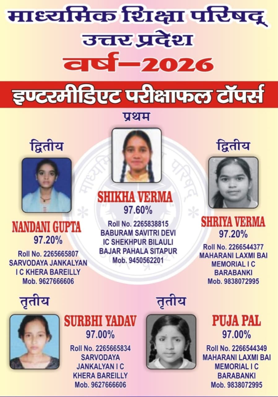 बाराबंकी में यूपी बोर्ड रिजल्ट 2026 में बेटियों का शानदार प्रदर्शन, हाईस्कूल और इंटरमीडिएट में कई छात्राओं ने टॉप टेन में बनाई जगह।