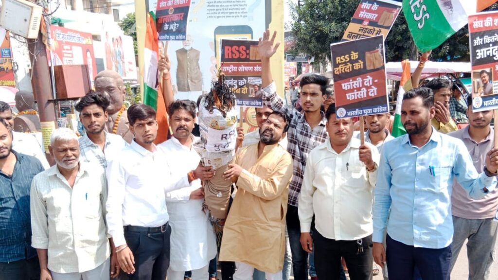 बाराबंकी में युवा कांग्रेस का प्रदर्शन, RSS का पुतला फूंका