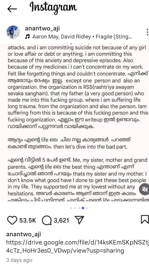 लेकिन इस घटना ने सनसनी तब फैलाई जब अनंदु का शेड्यूल्ड इंस्टाग्राम पोस्ट मौत के कुछ घंटे बाद सोशल मीडिया पर सामने आया। इस पोस्ट में अनंदु ने अपने बचपन में राष्ट्रीय स्वयंसेवक संघ (RSS) के सदस्यों द्वारा किए गए बार-बार के यौन शोषण का ज़िक्र किया है और लिखा है कि उसी मानसिक आघात ने उन्हें जीवन समाप्त करने के लिए मजबूर किया।