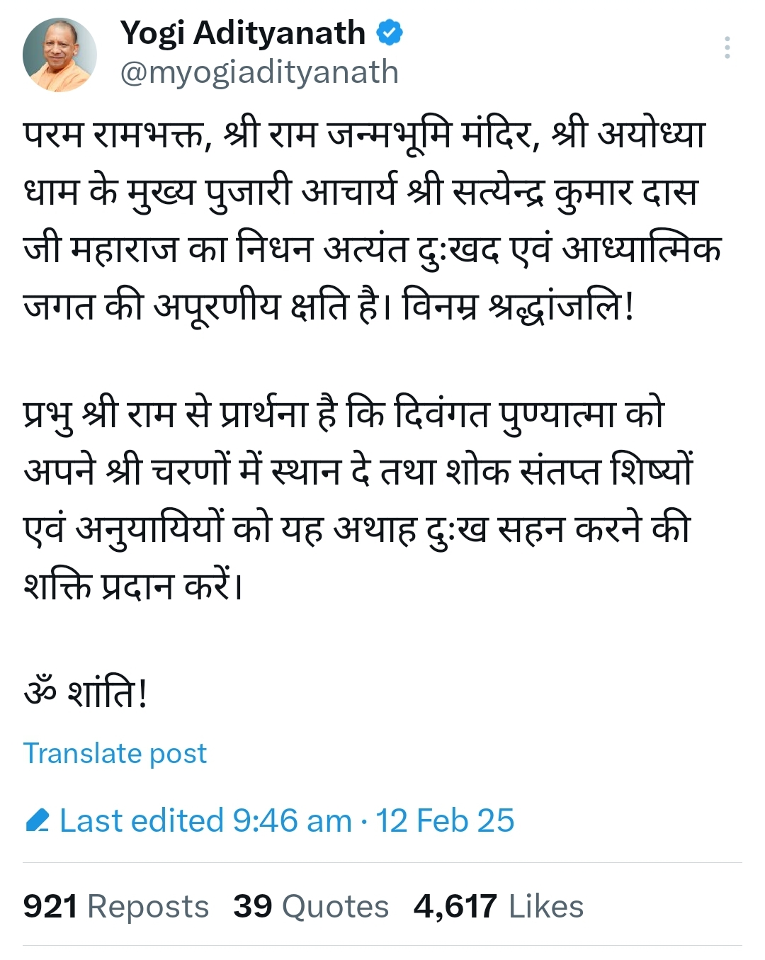 सीएम योगी ने एक्स पर लिखा, ”परम रामभक्त, श्री राम जन्मभूमि मंदिर, श्री अयोध्या धाम के मुख्य पुजारी आचार्य श्री सत्येन्द्र कुमार दास जी महाराज का निधन अत्यंत दुःखद और आध्यात्मिक जगत की अपूरणीय क्षति है. विनम्र श्रद्धांजलि! प्रभु श्री राम से प्रार्थना है कि दिवंगत पुण्यात्मा को अपने श्री चरणों में स्थान दे तथा शोक संतप्त शिष्यों एवं अनुयायियों को यह अथाह दुःख सहन करने की शक्ति प्रदान करें. ॐ शांति!