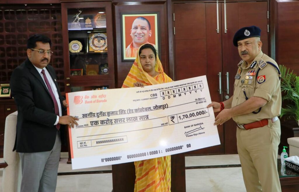 मुख्य आरक्षी दुर्गेश कुमार सिंह: जनपद जौनपुर में तैनात मुख्य आरक्षी दुर्गेश कुमार सिंह के परिजनों को 1 करोड़ 70 लाख रुपये का चेक दिया गया। दुर्गेश सिंह की मृत्यु गो तस्करों द्वारा ड्यूटी के दौरान वाहन रोकते समय कुचल दिए जाने से हुई थी।