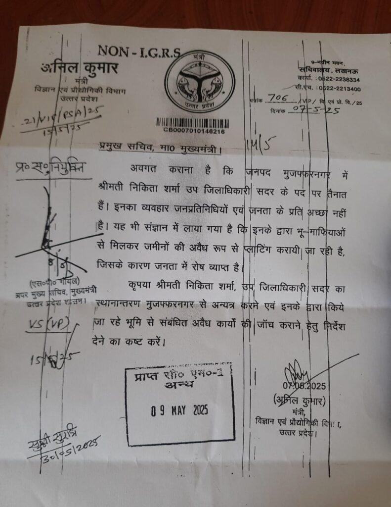 मुजफ्फरनगर में प्रशासनिक और राजनीतिक गलियारों में उस समय हड़कंप मच गया, जब उत्तर प्रदेश सरकार के कैबिनेट मंत्री अनिल कुमार का एक सनसनीखेज पत्र सोशल मीडिया पर वायरल हो गया। इस पत्र में उन्होंने महिला उप जिलाधिकारी (SDM) सदर निकिता शर्मा पर भूमाफियाओं के साथ मिलकर बड़े पैमाने पर अवैध प्लॉटिंग कराने के बेहद गंभीर आरोप लगाए हैं। यह घटना ऐसे समय में सामने आई है, जब जनपद में सत्ताधारी दलों के नेताओं और अधिकारियों के बीच पहले से ही चली आ रही तनातनी अपने चरम पर है।